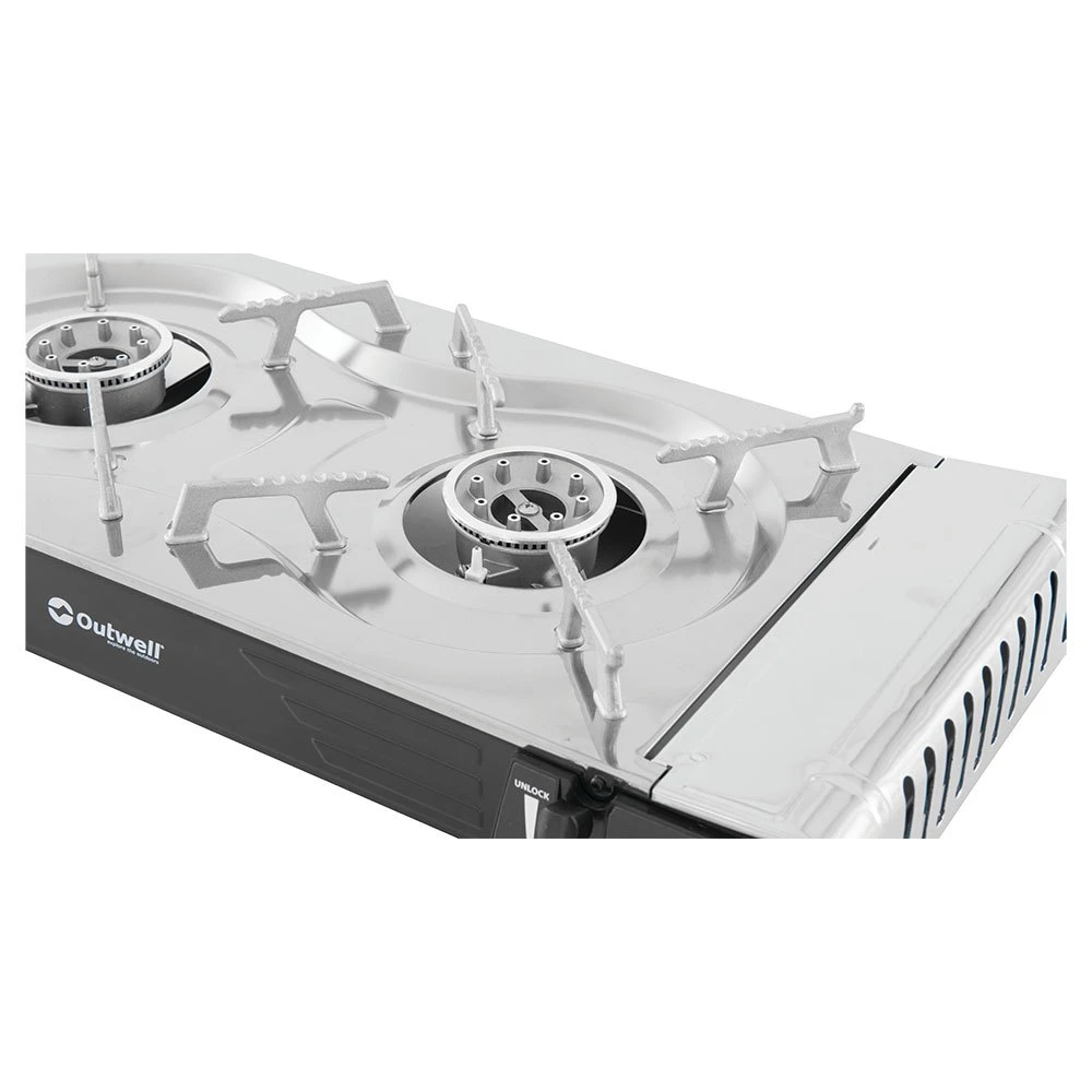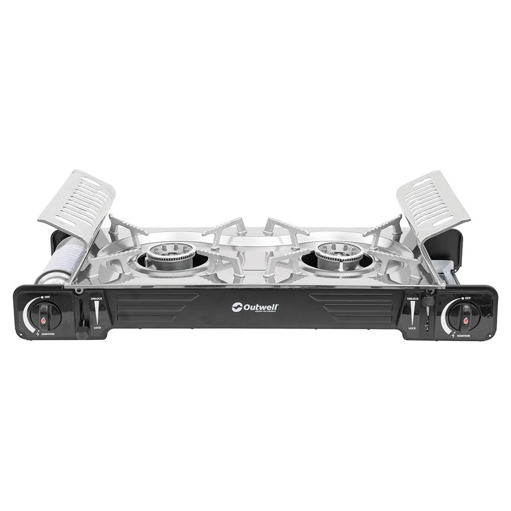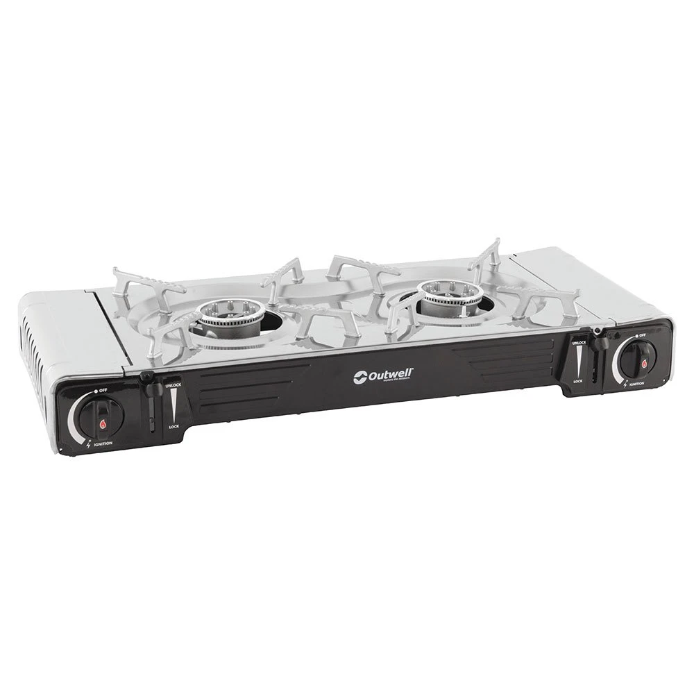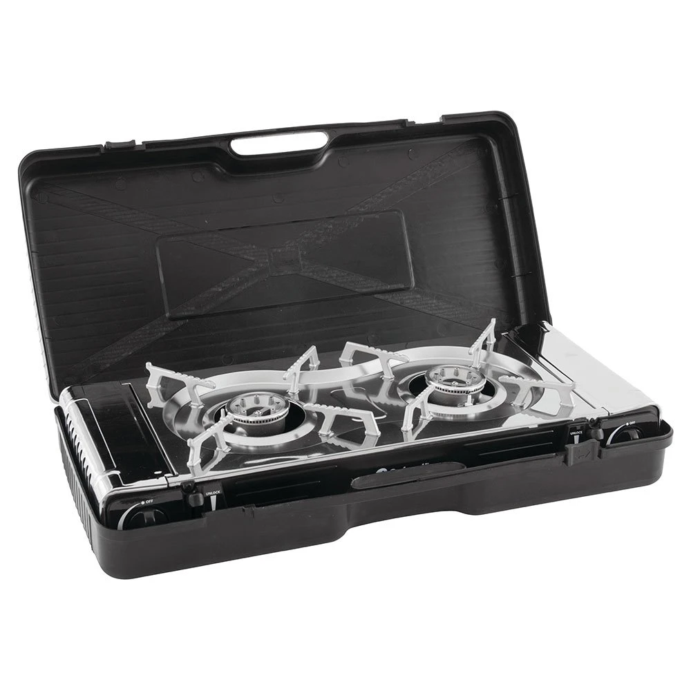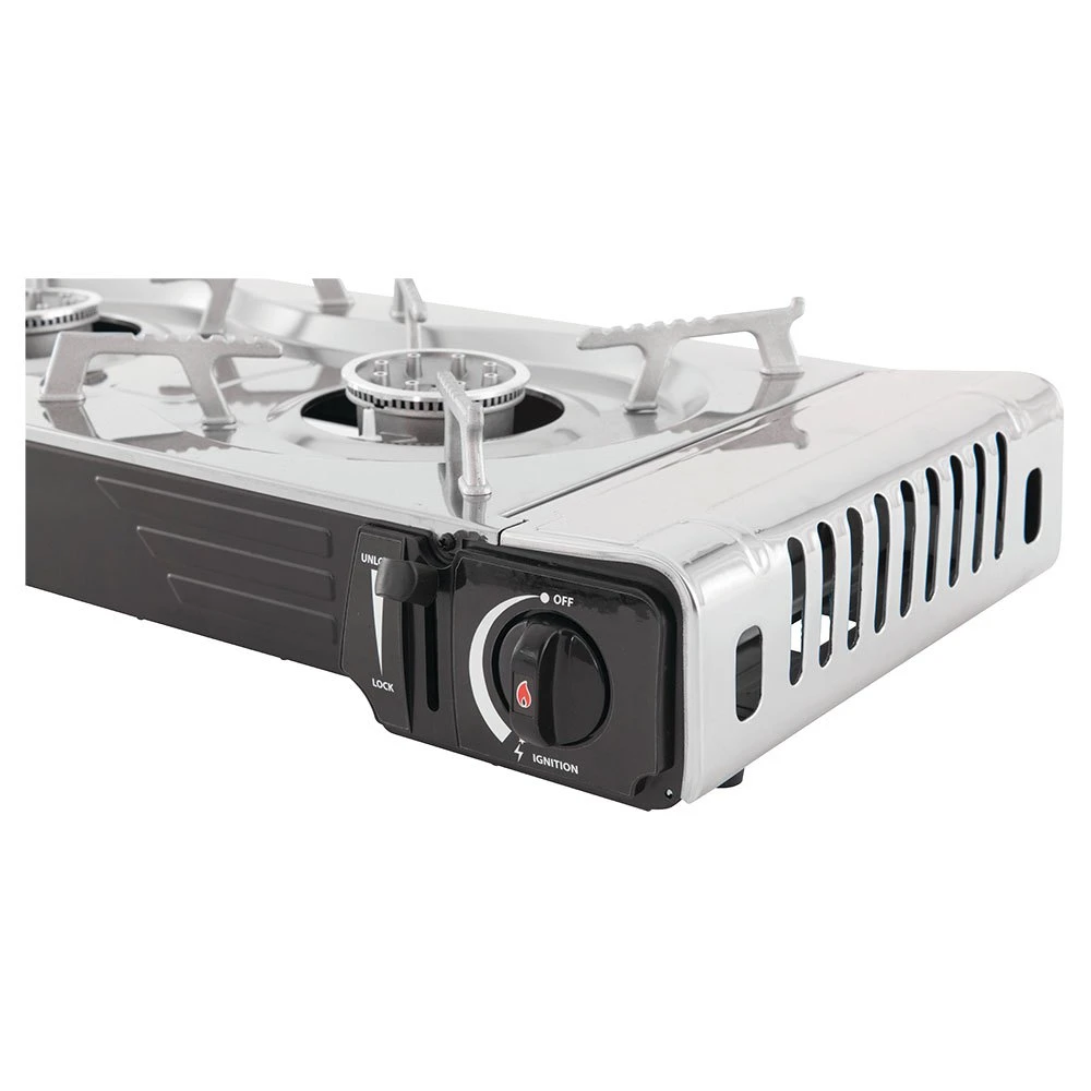 Two-burner piezo ignition stove, each powered by its own easily obtainable gas cartridge for versatile convenience, offers a practical cooking option perfect for groups and families on the move, on the beach or for emergency use.