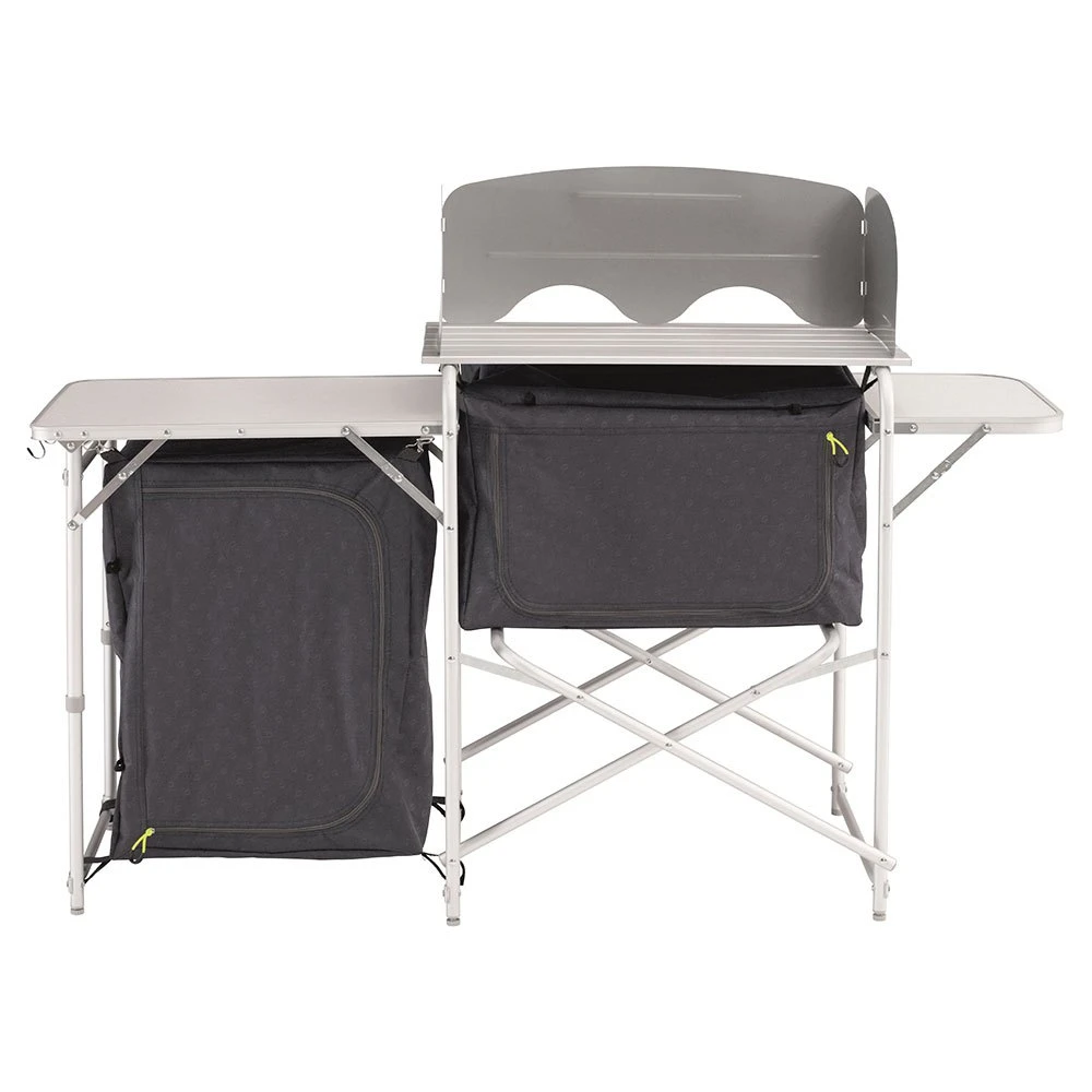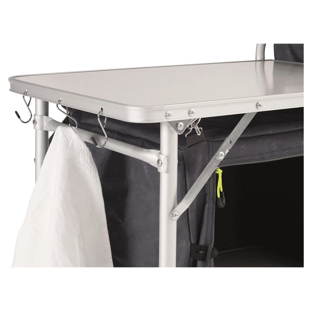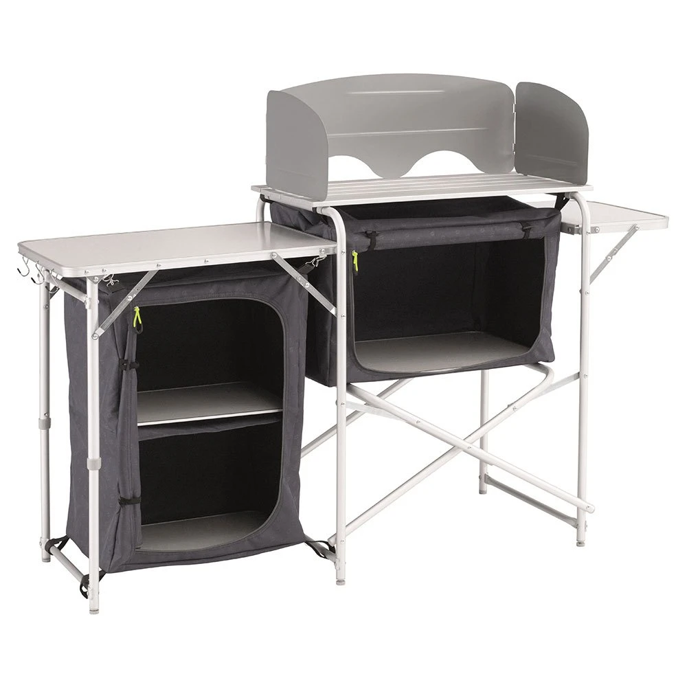Easy to use, lightweight aluminium kitchen unit offering excellent cupboard and workspace required by a family for storage and food preparation, in a compact package for convenient transportation.